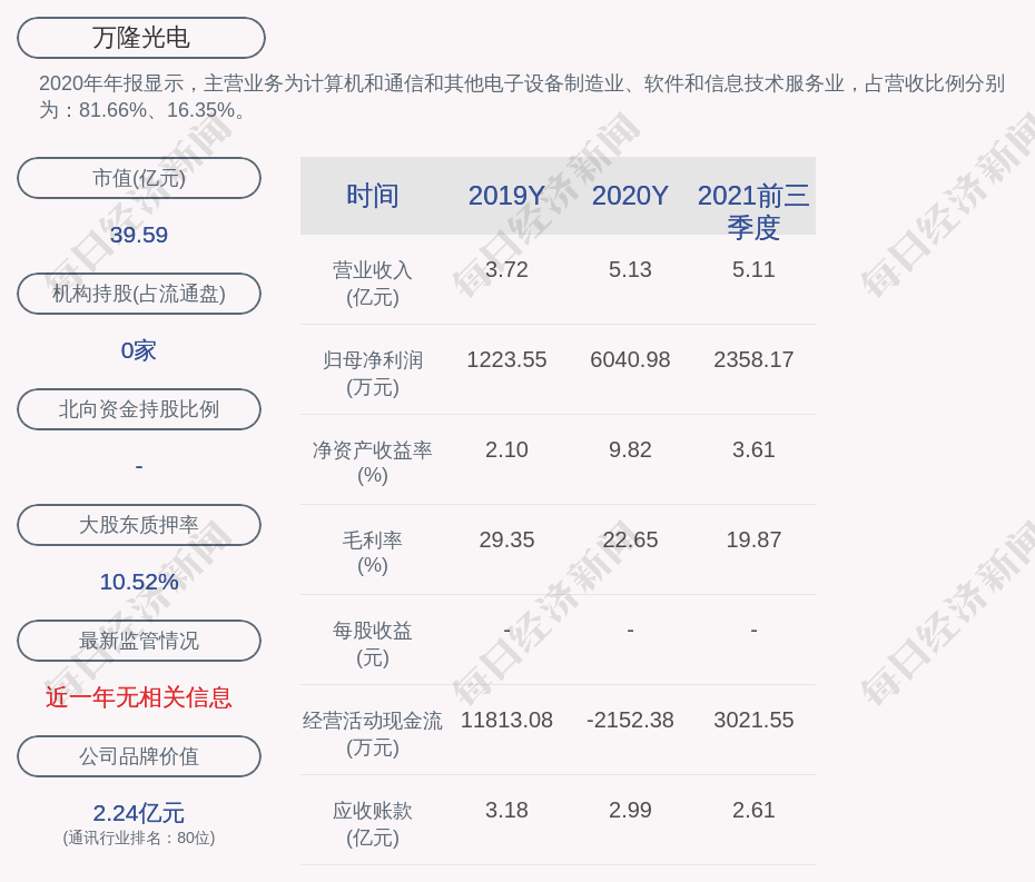 2020年年报显示,万隆光电的主营业务为计算机和通信和其他电子设备制造业、软件和信息技术服务业,占营收比例分别为:81.66%、16.35%。