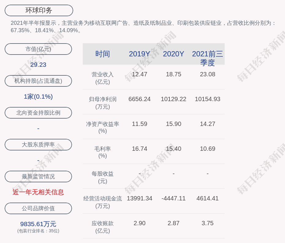 2021年半年报显示,环球印务的主营业务为移动互联网广告、造纸及纸制品业、印刷包装供应链业,占营收比例分别为:67.35%、18.41%、14.09%。