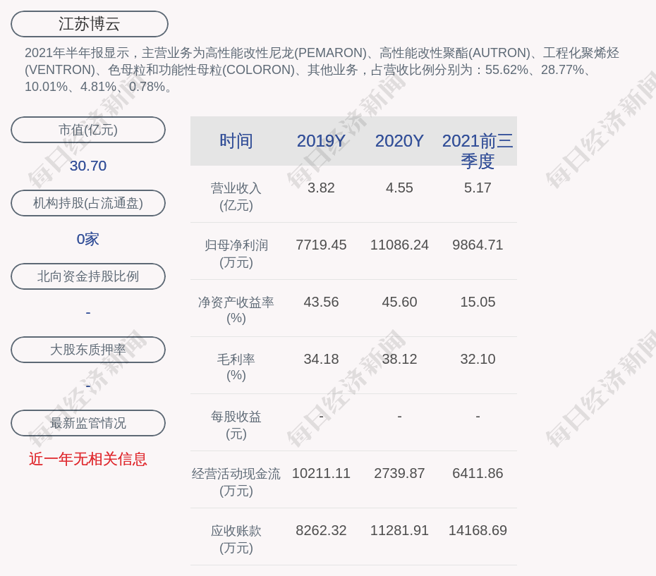 2021年半年报显示,江苏博云的主营业务为高性能改性尼龙(PEMARON)、高性能改性聚酯(AUTRON)、工程化聚烯烃(VENTRON)、色母粒和功能性母粒(COLORON)、其他业务,占营收比例分别为:55.62%、28.77%、10.01%、4.81%、0.78%。