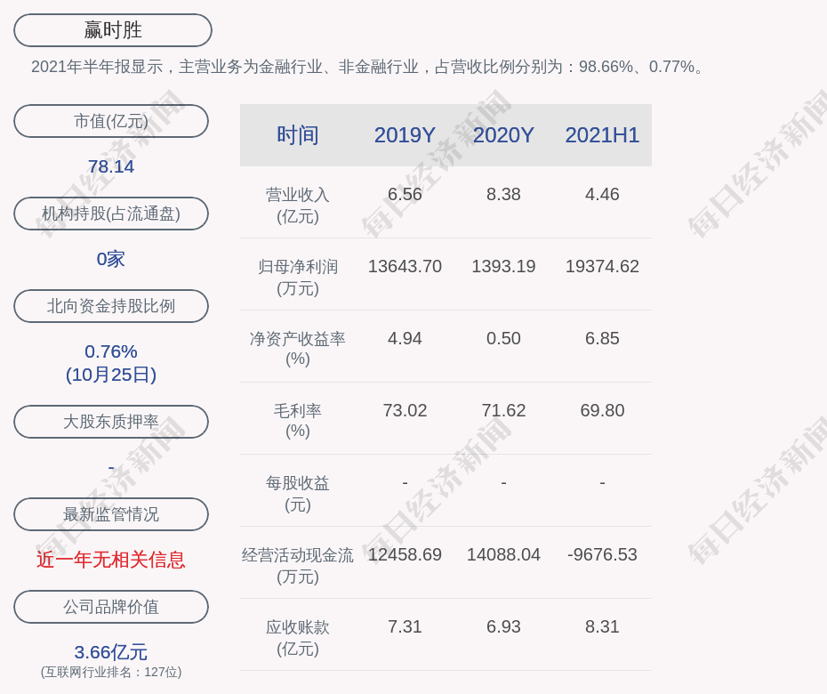 2021年半年报显示,赢时胜的主营业务为金融行业、非金融行业,占营收比例分别为:98.66%、0.77%。