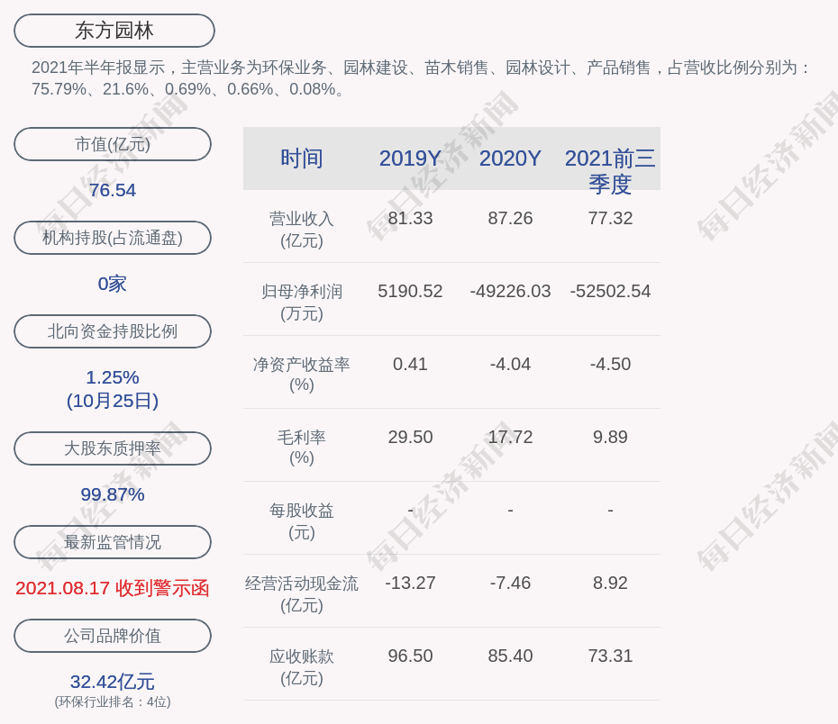 2021年半年报显示,东方园林的主营业务为环保业务、园林建设、苗木销售、园林设计、产品销售,占营收比例分别为:75.79%、21.6%、0.69%、0.66%、0.08%。