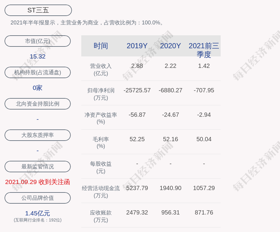 2021年半年报显示,ST三五的主营业务为商业,占营收比例为:100.0%。
