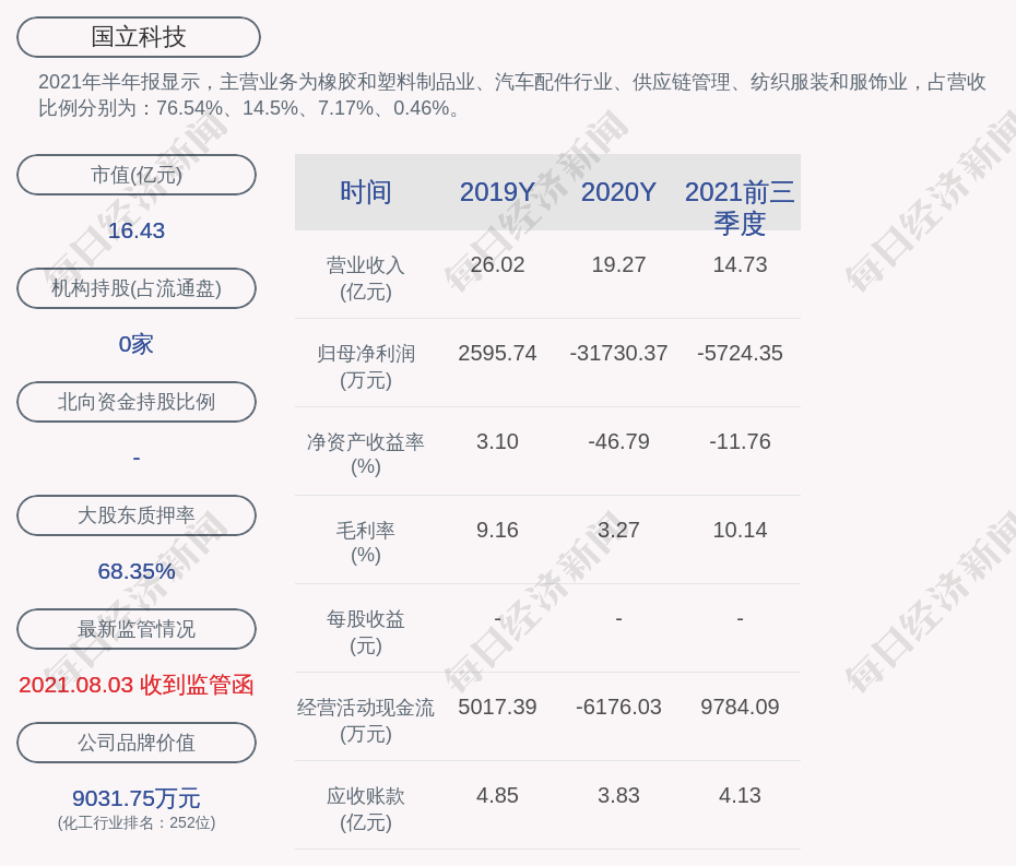 2021年半年报显示,国立科技的主营业务为橡胶和塑料制品业、汽车配件行业、供应链管理、纺织服装和服饰业,占营收比例分别为:76.54%、14.5%、7.17%、0.46%。