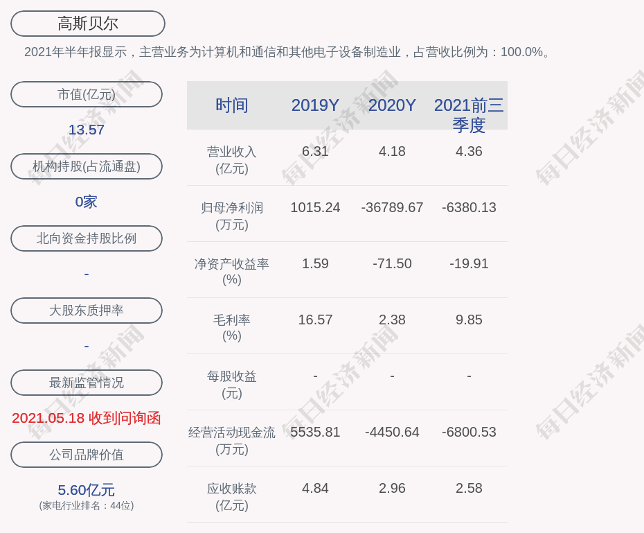 2021年半年报显示,高斯贝尔的主营业务为计算机和通信和其他电子设备制造业,占营收比例为:100.0%。