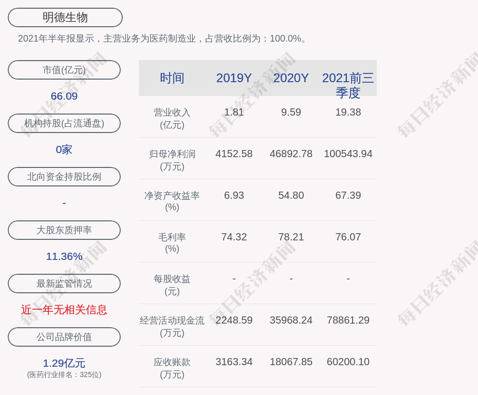 2021年半年报显示,明德生物的主营业务为医药制造业,占营收比例为:100.0%。