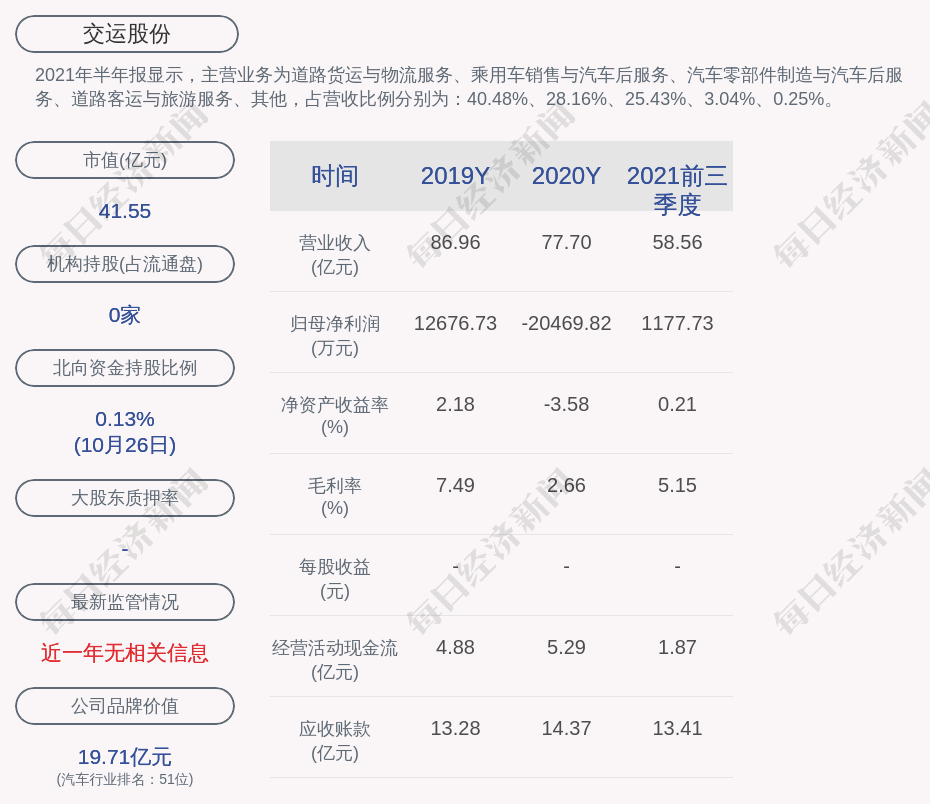 2021年半年报显示,交运股份的主营业务为道路货运与物流服务、乘用车销售与汽车后服务、汽车零部件制造与汽车后服务、道路客运与旅游服务、其他,占营收比例分别为:40.48%、28.16%、25.43%、3.04%、0.25%。