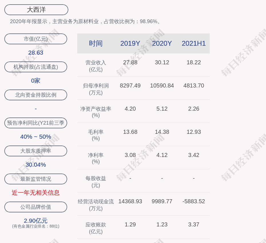 2020年年报显示,大西洋的主营业务为原材料业,占营收比例为:98.96%。