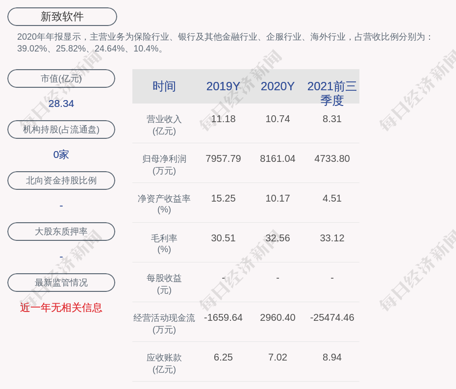 2020年年报显示,新致软件的主营业务为保险行业、银行及其他金融行业、企服行业、海外行业,占营收比例分别为:39.02%、25.82%、24.64%、10.4%。