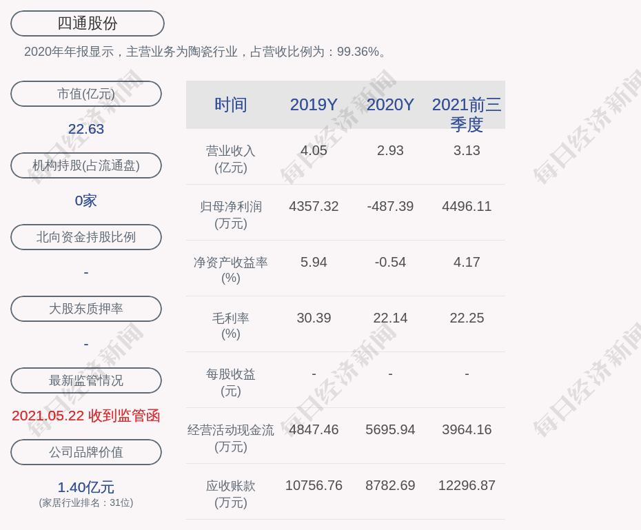 2020年年报显示,四通股份的主营业务为陶瓷行业,占营收比例为:99.36%。