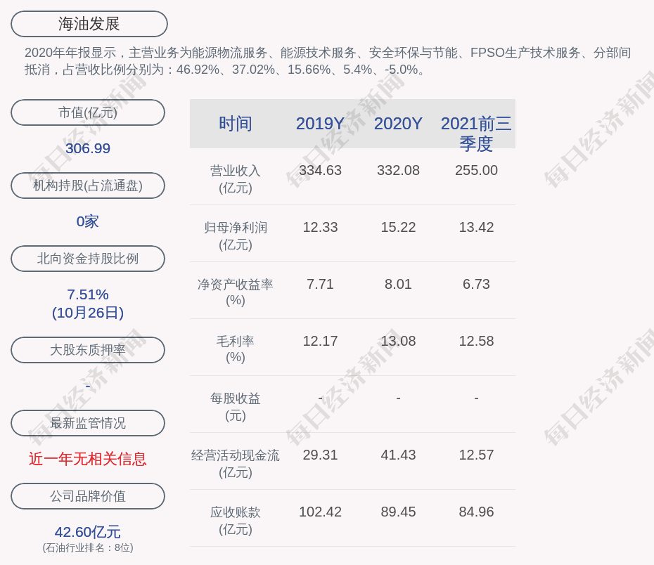 2020年年报显示,海油发展的主营业务为能源物流服务、能源技术服务、安全环保与节能、FPSO生产技术服务、分部间抵消,占营收比例分别为:46.92%、37.02%、15.66%、5.4%、-5.0%。