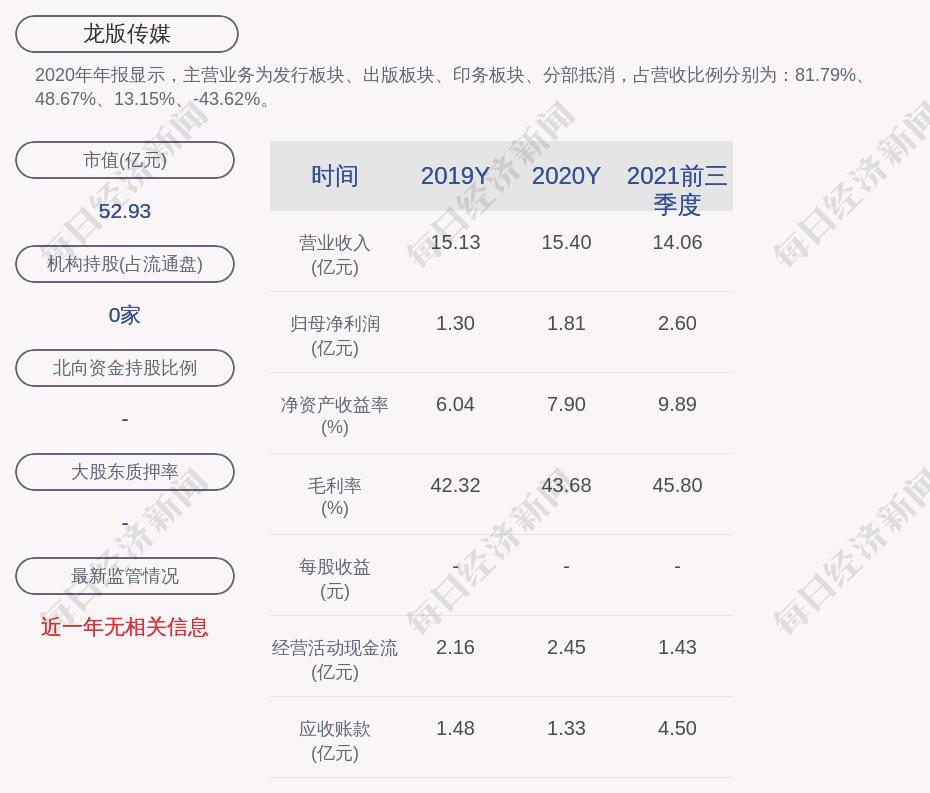 2020年年报显示,龙版传媒的主营业务为发行板块、出版板块、印务板块、分部抵消,占营收比例分别为:81.79%、48.67%、13.15%、-43.62%。