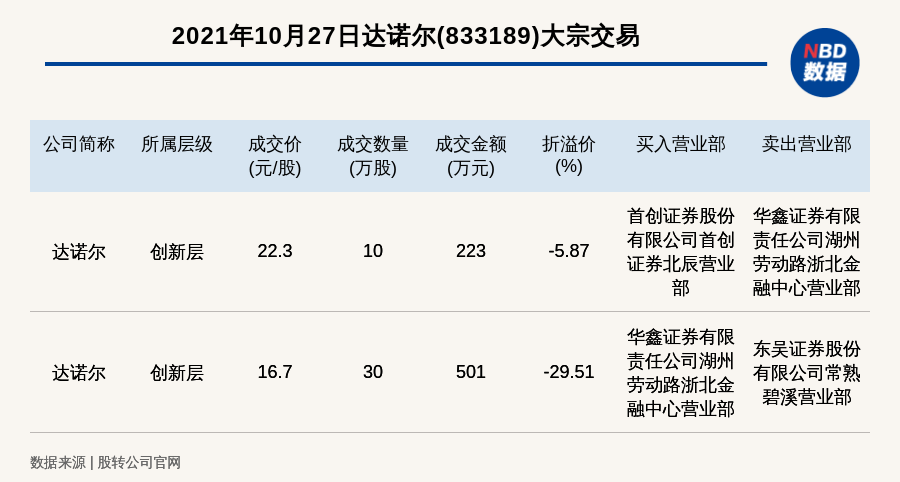 每经AI快讯,2021年10月27日,新三板创新层公司达诺尔(833189)发生2笔大宗交易,总成交金额为724万元,成交金额最高的一笔成交价16.7元/股,成交数量30万股,成交金额501万元,折价29.51%。买入营业部是华鑫证券有限责任公司湖州劳动路浙北金融中心营业部,卖出营业部是东吴证券股份有限公司常熟碧溪营业部。