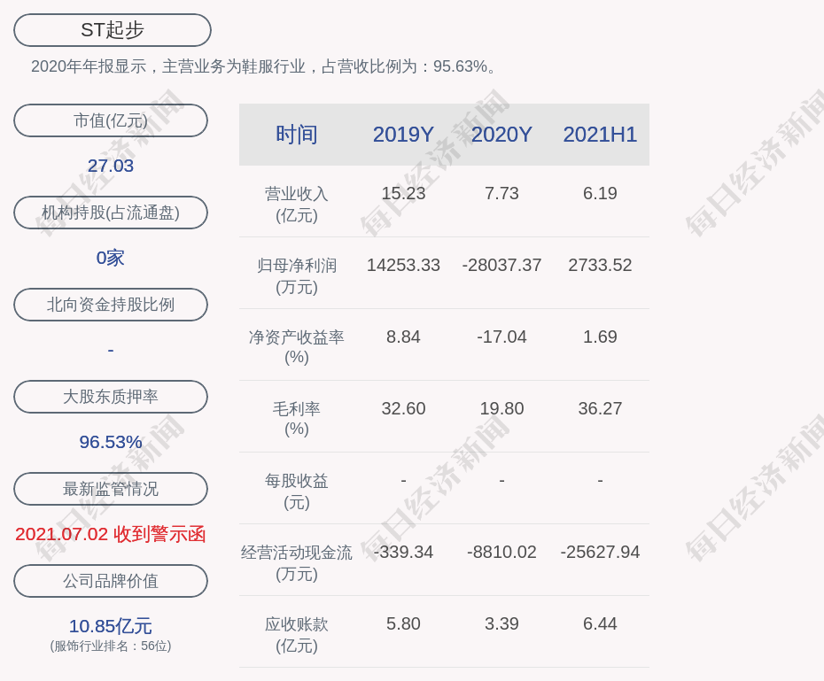 2020年年报显示,ST起步的主营业务为鞋服行业,占营收比例为:95.63%。