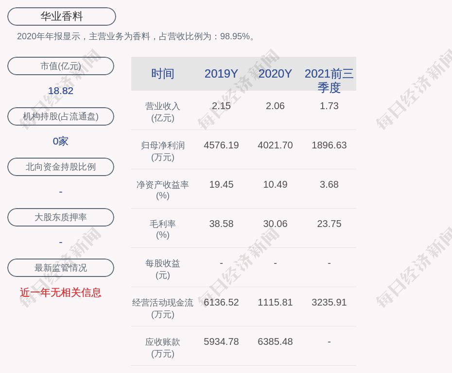 2020年年报显示,华业香料的主营业务为香料,占营收比例为:98.95%。