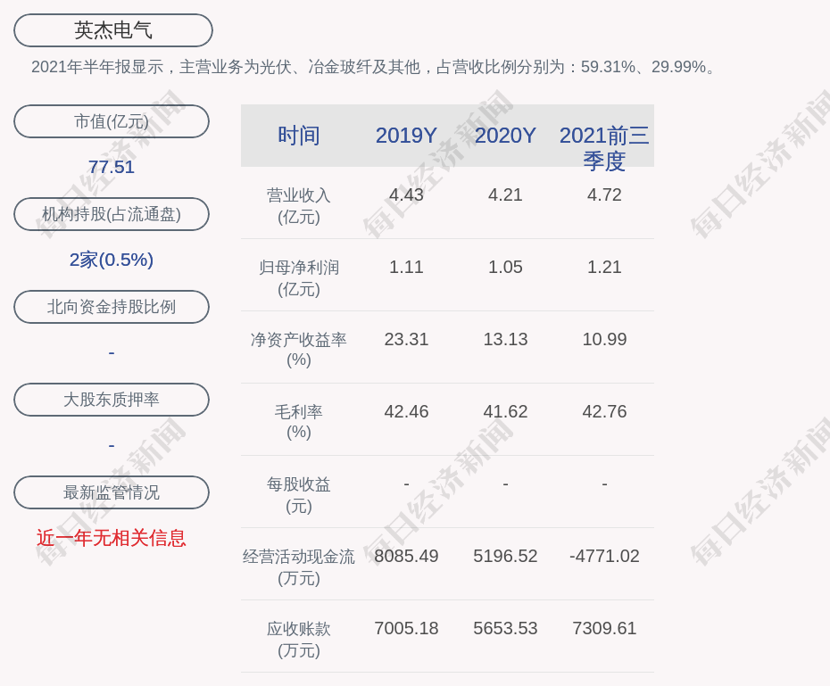 2021年半年报显示,英杰电气的主营业务为光伏、冶金玻纤及其他,占营收比例分别为:59.31%、29.99%。