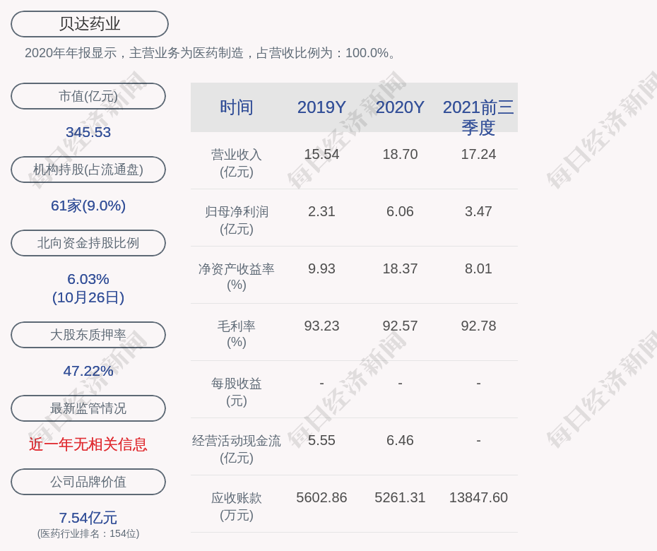 2020年年报显示,贝达药业的主营业务为医药制造,占营收比例为:100.0%。