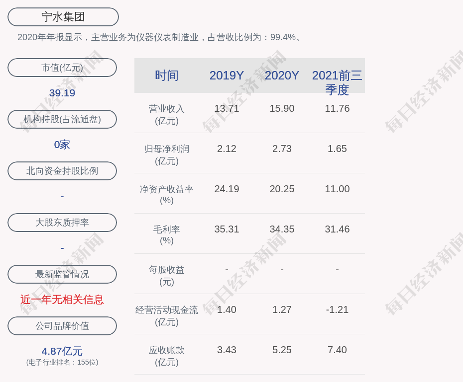2020年年报显示,宁水集团的主营业务为仪器仪表制造业,占营收比例为:99.4%。