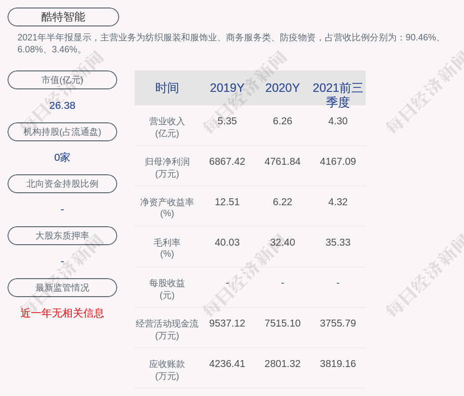 2021年半年报显示,酷特智能的主营业务为纺织服装和服饰业、商务服务类、防疫物资,占营收比例分别为:90.46%、6.08%、3.46%。
