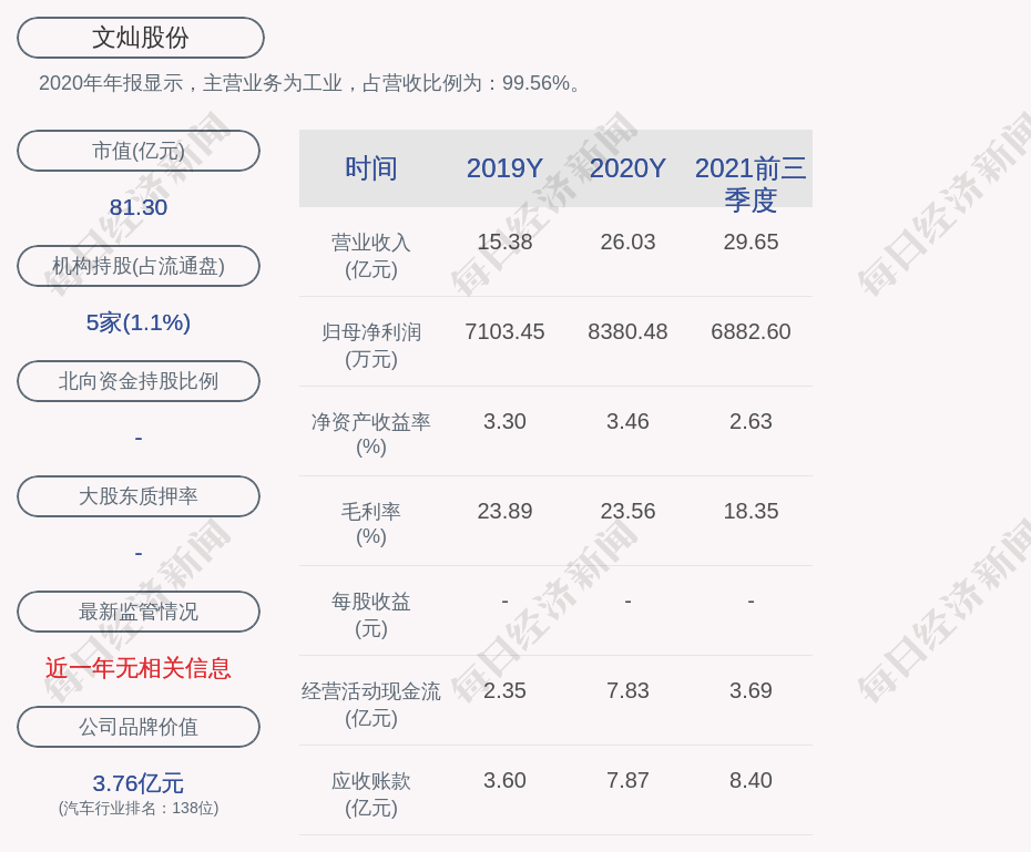 2020年年报显示,文灿股份的主营业务为工业,占营收比例为:99.56%。