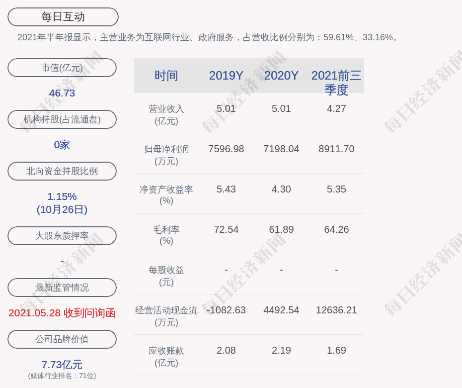 2021年半年报显示,每日互动的主营业务为互联网行业、政府服务,占营收比例分别为:59.61%、33.16%。