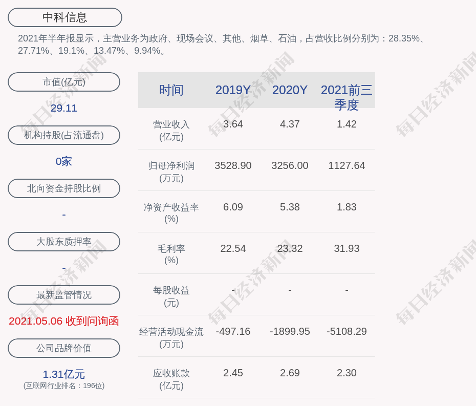 2021年半年报显示,中科信息的主营业务为政府、现场会议、其他、烟草、石油,占营收比例分别为:28.35%、27.71%、19.1%、13.47%、9.94%。