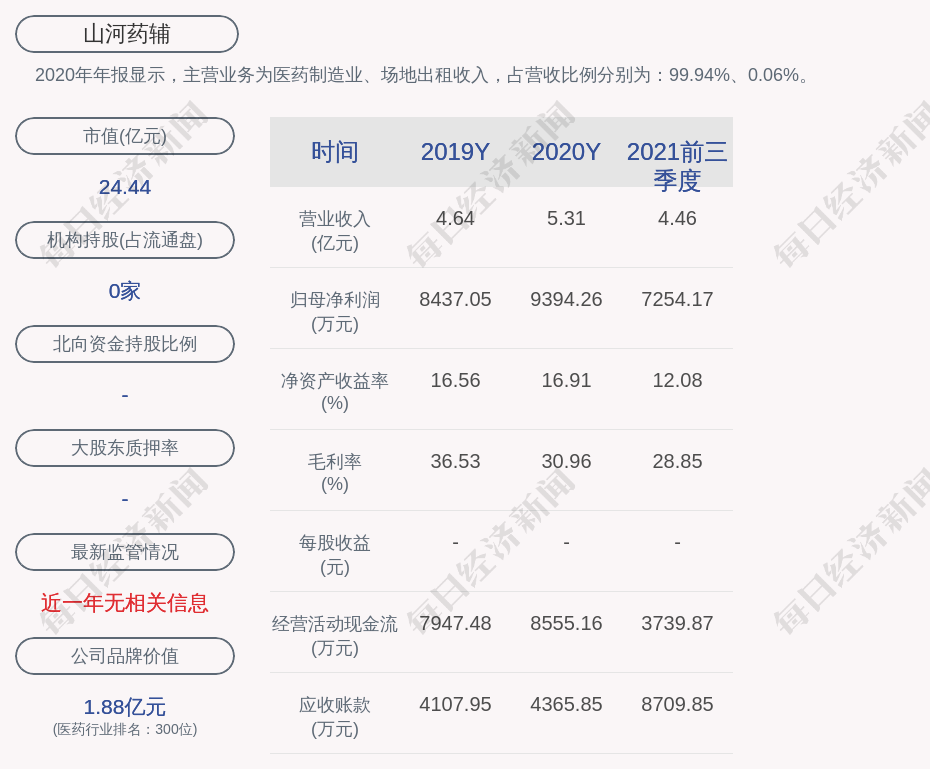 2020年年报显示,山河药辅的主营业务为医药制造业、场地出租收入,占营收比例分别为:99.94%、0.06%。