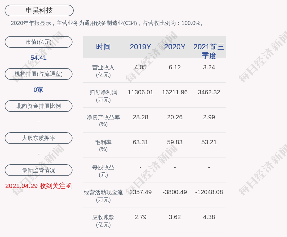2020年年报显示,申昊科技的主营业务为通用设备制造业(C34),占营收比例为:100.0%。