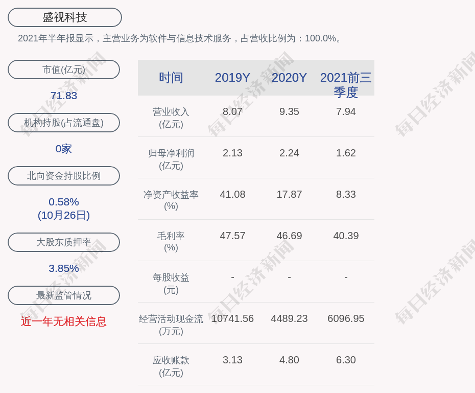2021年半年报显示,盛视科技的主营业务为软件与信息技术服务,占营收比例为:100.0%。
