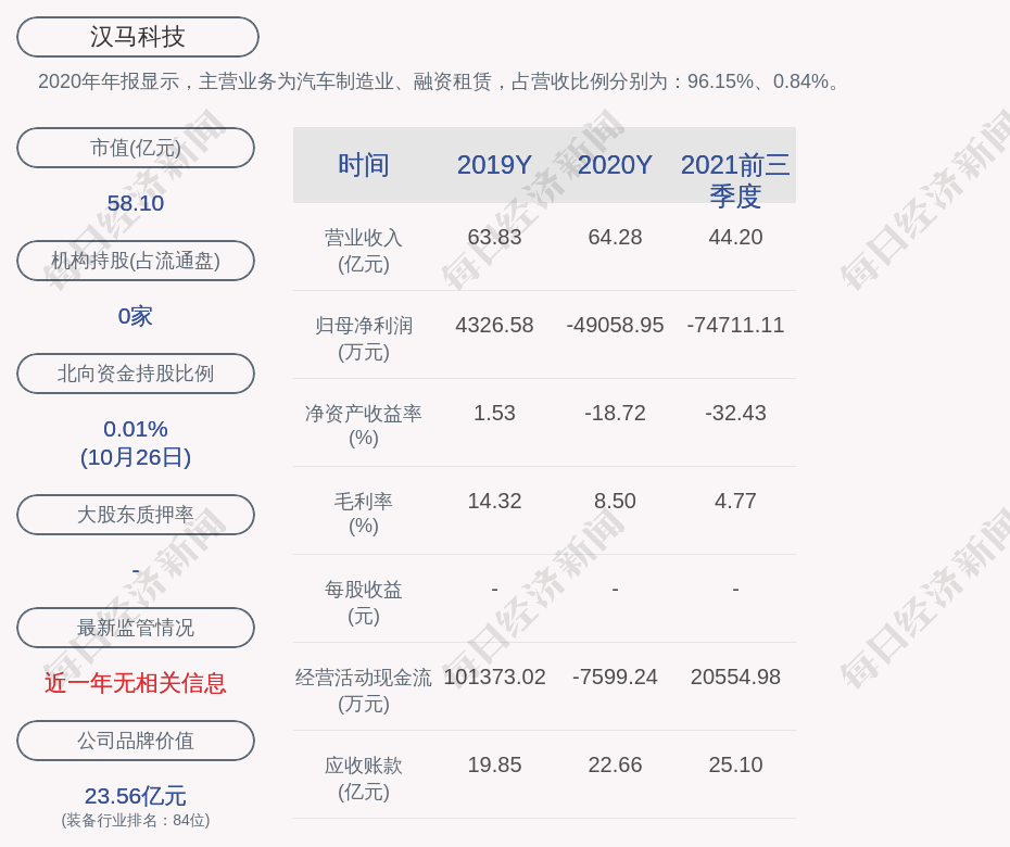 2020年年报显示,汉马科技的主营业务为汽车制造业、融资租赁,占营收比例分别为:96.15%、0.84%。