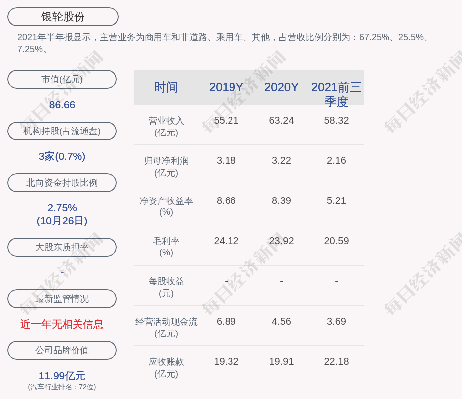 2021年半年报显示,银轮股份的主营业务为商用车和非道路、乘用车、其他,占营收比例分别为:67.25%、25.5%、7.25%。