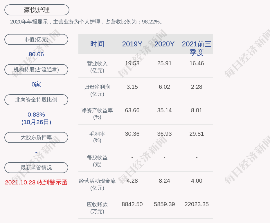 2020年年报显示,豪悦护理的主营业务为个人护理,占营收比例为:98.22%。