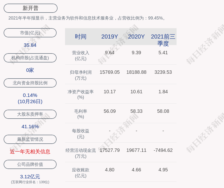 2021年半年报显示,新开普的主营业务为软件和信息技术服务业,占营收比例为:99.45%。