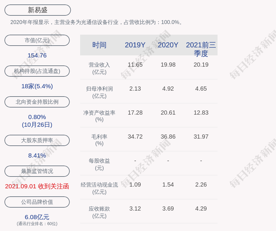 2020年年报显示,新易盛的主营业务为光通信设备行业,占营收比例为:100.0%。