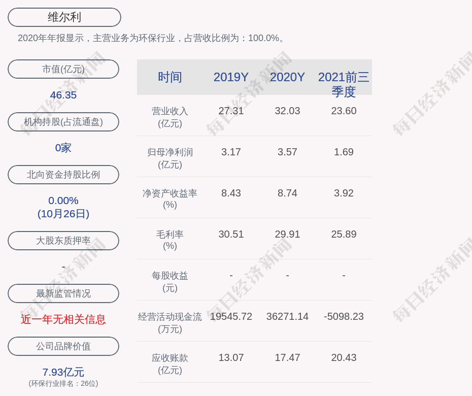 2020年年报显示,维尔利的主营业务为环保行业,占营收比例为:100.0%。