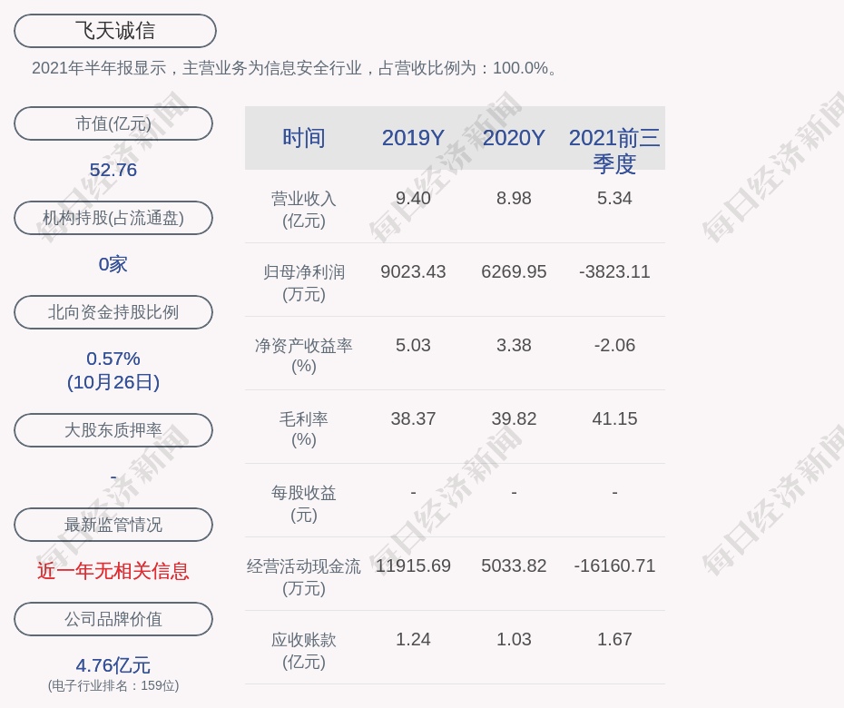 2021年半年报显示,飞天诚信的主营业务为信息安全行业,占营收比例为:100.0%。