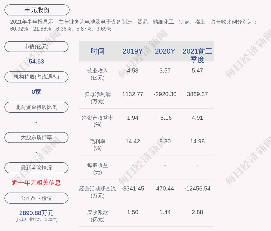 2021年半年报显示,丰元股份的主营业务为电池及电子设备制造、贸易、精细化工、制药、稀土,占营收比例分别为:60.92%、21.88%、6.36%、5.87%、3.69%。