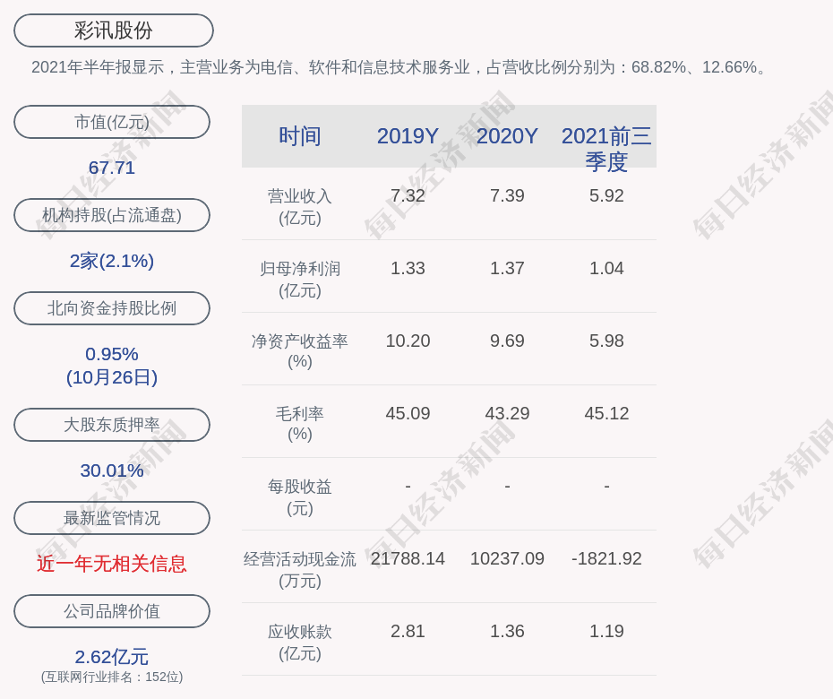 2021年半年报显示,彩讯股份的主营业务为电信、软件和信息技术服务业,占营收比例分别为:68.82%、12.66%。