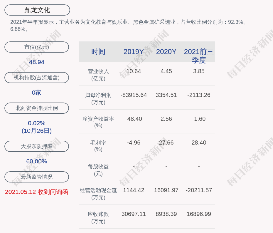 2021年半年报显示,鼎龙文化的主营业务为文化教育与娱乐业、黑色金属矿采选业,占营收比例分别为:92.3%、6.88%。