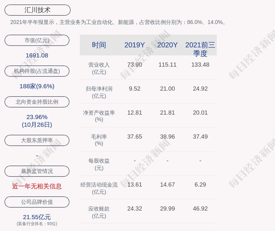 2021年半年报显示,汇川技术的主营业务为工业自动化、新能源,占营收比例分别为:86.0%、14.0%。