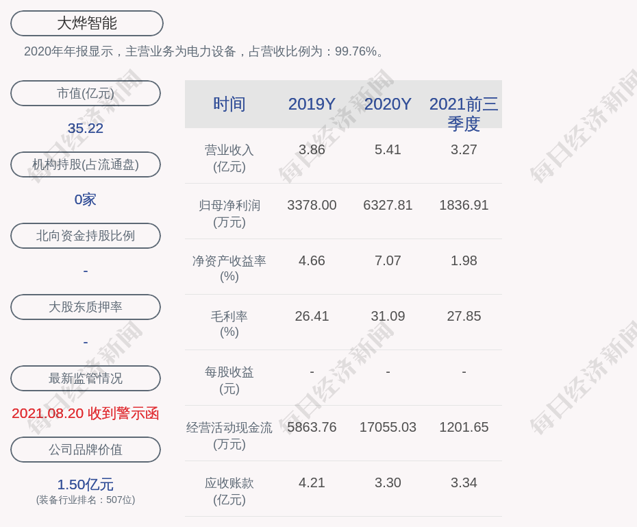 2020年年报显示,大烨智能的主营业务为电力设备,占营收比例为:99.76%。