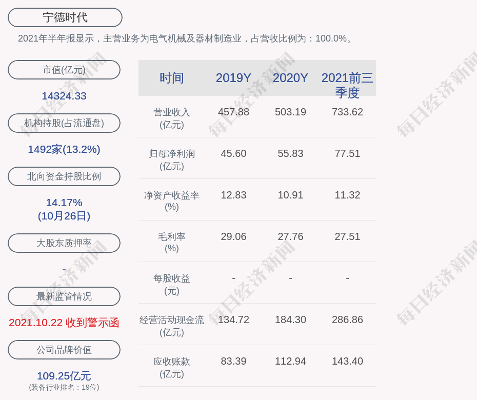 2021年半年报显示,宁德时代的主营业务为电气机械及器材制造业,占营收比例为:100.0%。