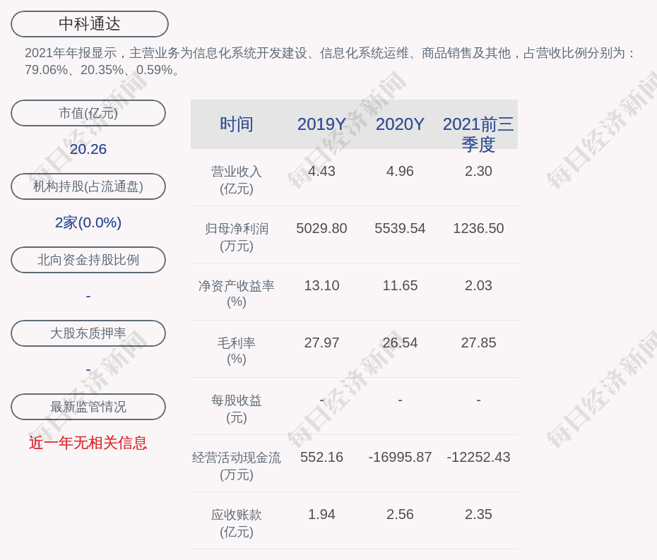 2021年年报显示,中科通达的主营业务为信息化系统开发建设、信息化系统运维、商品销售及其他,占营收比例分别为:79.06%、20.35%、0.59%。