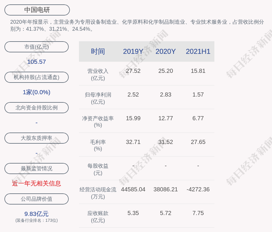 2020年年报显示,中国电研的主营业务为专用设备制造业、化学原料和化学制品制造业、专业技术服务业,占营收比例分别为:41.37%、31.21%、24.54%。