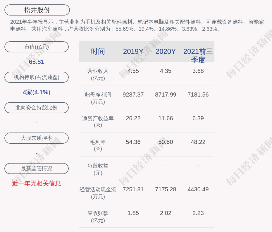 2021年半年报显示,松井股份的主营业务为手机及相关配件涂料、笔记本电脑及相关配件涂料、可穿戴设备涂料、智能家电涂料、乘用汽车涂料,占营收比例分别为:55.69%、19.4%、14.86%、3.63%、2.63%。