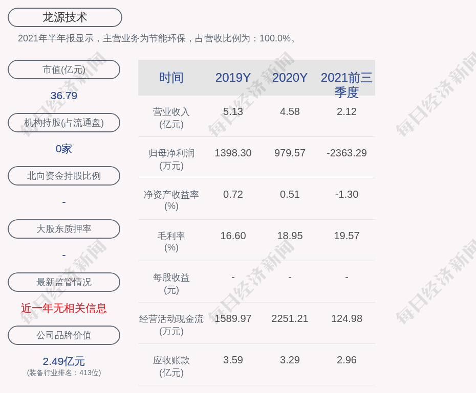 2021年半年报显示,龙源技术的主营业务为节能环保,占营收比例为:100.0%。