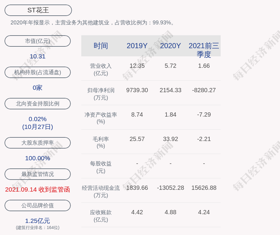 2020年年报显示,ST花王的主营业务为其他建筑业,占营收比例为:99.93%。