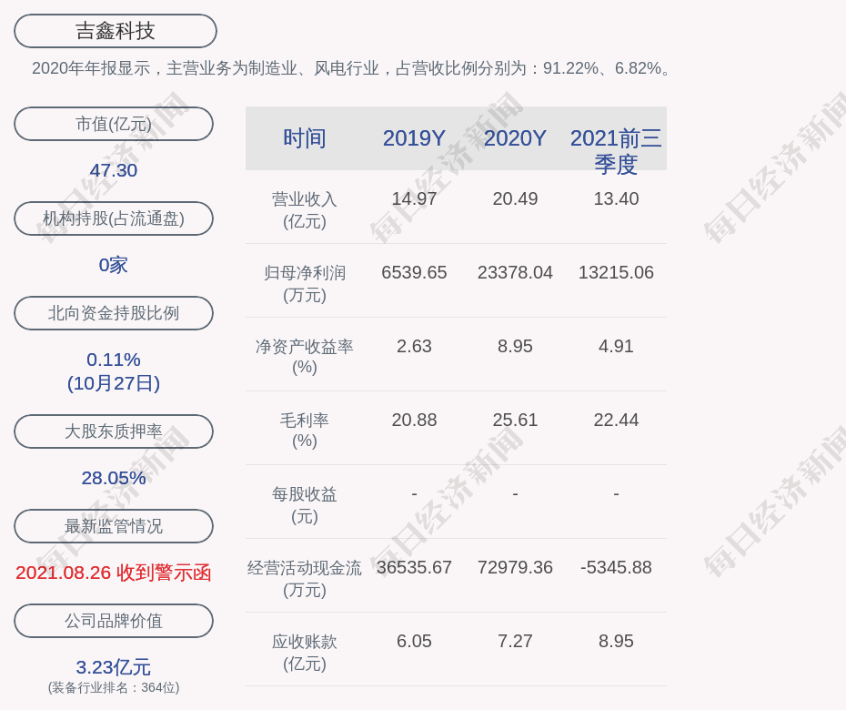 2020年年报显示,吉鑫科技的主营业务为制造业、风电行业,占营收比例分别为:91.22%、6.82%。