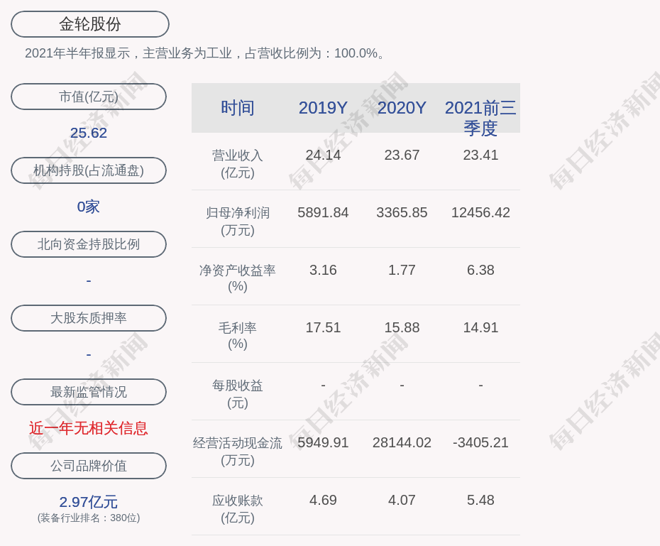 2021年半年报显示,金轮股份的主营业务为工业,占营收比例为:100.0%。