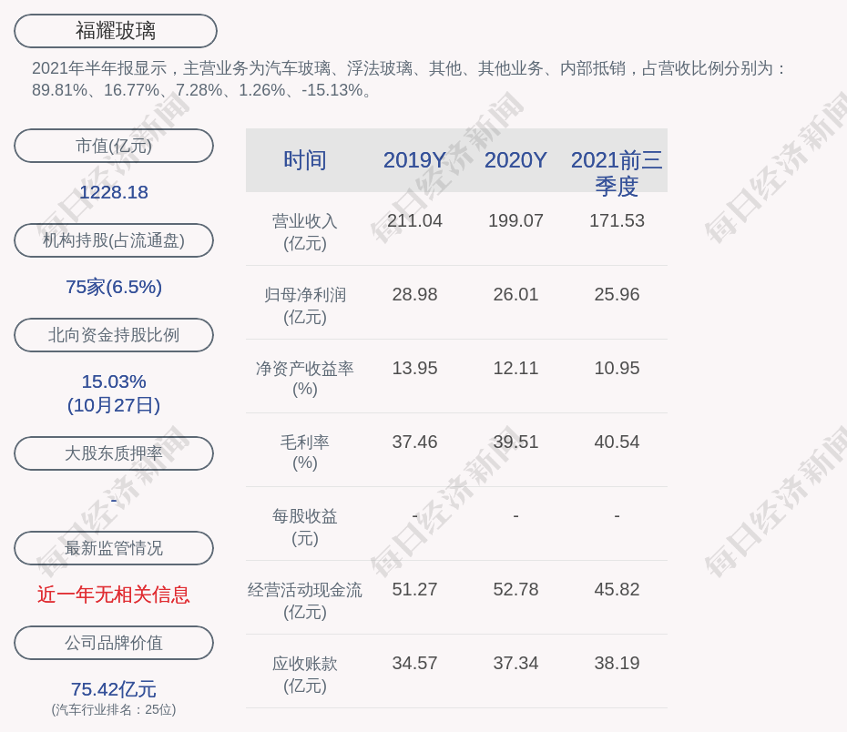 2021年半年报显示,福耀玻璃的主营业务为汽车玻璃、浮法玻璃、其他、其他业务、内部抵销,占营收比例分别为:89.81%、16.77%、7.28%、1.26%、-15.13%。