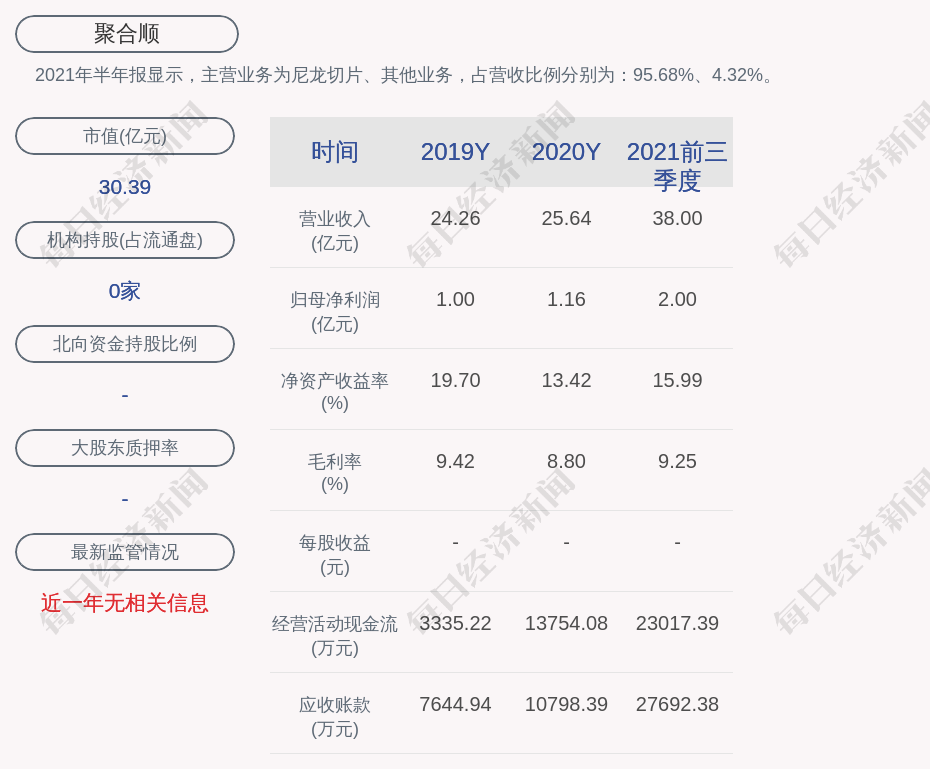 2021年半年报显示,聚合顺的主营业务为尼龙切片、其他业务,占营收比例分别为:95.68%、4.32%。